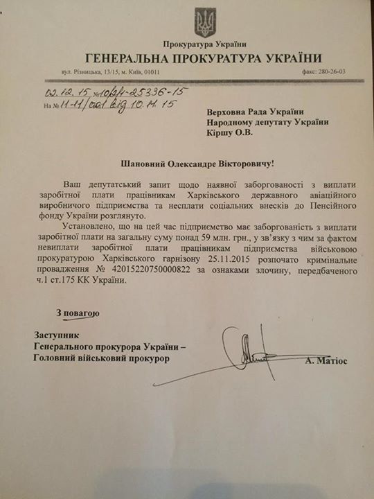 По факту невыплаты зарплаты работникам Харьковского государственного авиационного производственного предприятия открыто уголовное производство, сообщил в Facebook народный депутат Александр Кирш, пишет Главное.