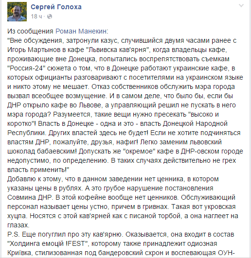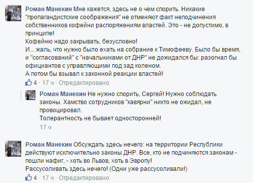Сепаратисты страшно возмущаются и обнародовали гневные тирады в соцсетях. Особенно старались донецкий политолог и сторонник «русского мира» Роман Манекин и донецкий фотограф Сергей Голоха.