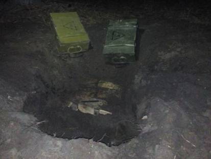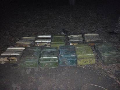 Правоохоронці вилучили зі схованки п’ять ящиків гранат Ф-1 та РГД загальною кількістю сто штук, ящик з двадцятьма гранатами РГН російського виробництва та майже одинадцять тисяч набоїв різного калібру.