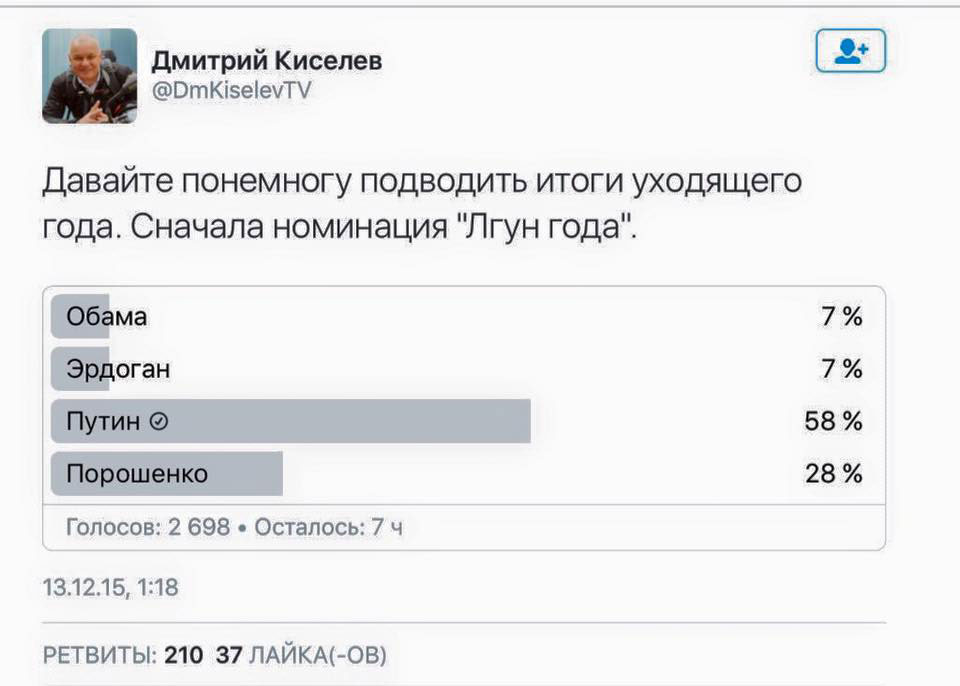 Какая прекрасная история в Твиттере Дмитрия Киселева. Он провёл опрос, а потом стёр результаты. Но все ходы записаны…