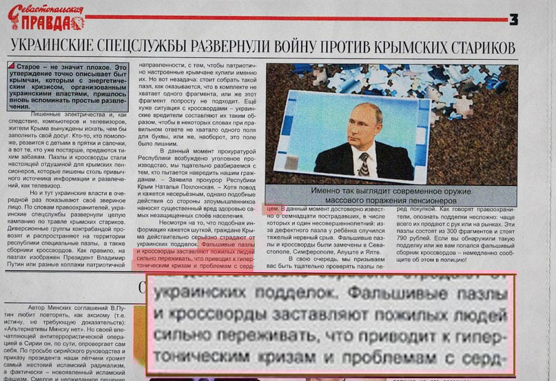 "Но и тут украинские власти в очередной раз показывают свое звериное лицо. По словам правоохранителей, украинские спецслужбы развернули целую кампанию по травле крымских стариков. Диверсионные группы контрабандой провозят и распространяют на территории республики специальные пазлы, а также сборники кроссвордов. Как правило, на пазлах изображен президент Владимир Путин или разные коллажи патриотичной направленности, с тем, чтобы патриотично настроенные крымчане купили именно их. Но вот незадача: стоит собрать такой пазл, как оказывается, что в комплекте не хватает одного фрагмента, или же этот фрагмент попросту не подходит. Еще хуже ситуация с кроссвордами — украинские вредители составляют их таким образом, чтобы в некоторых словах при правильном ответе не хватало одного поля для буквы или же наоборот, это поле было лишним", — говорится в статье.