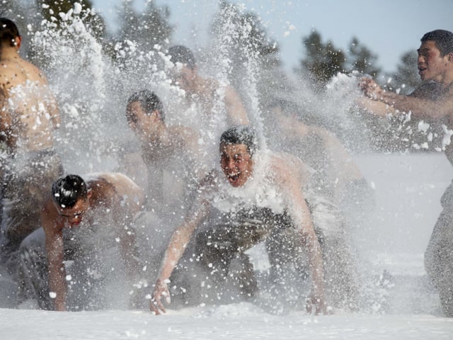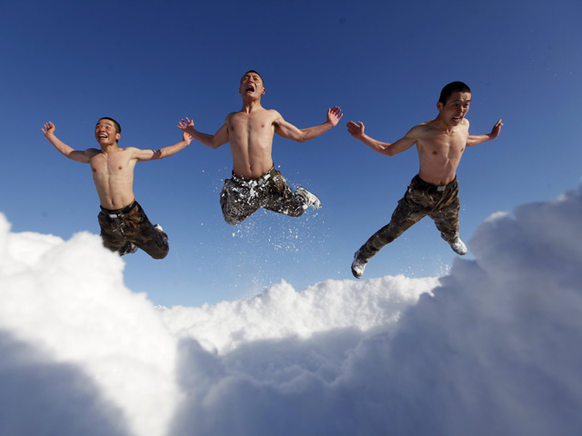 В Сети появилась новая серия фотографий с учений китайских военных, которых заставляют тренироваться в сильный мороз. При минусовой температуре солдаты на границе с Россией упражнялись по пояс голыми, попутно натирая себя снегом. Учения в суровых погодных условиях также прошли в Синьцзян-Уйгурском автономном районе КНР, где военных хотя бы не стали раздевать.