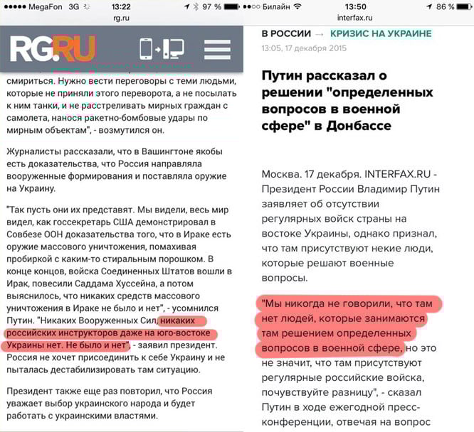 Ниже - как изменилась риторика Путина с июня 2014-го (слева) по вчерашний день (справа). "Почувствуйте разницу" (с).