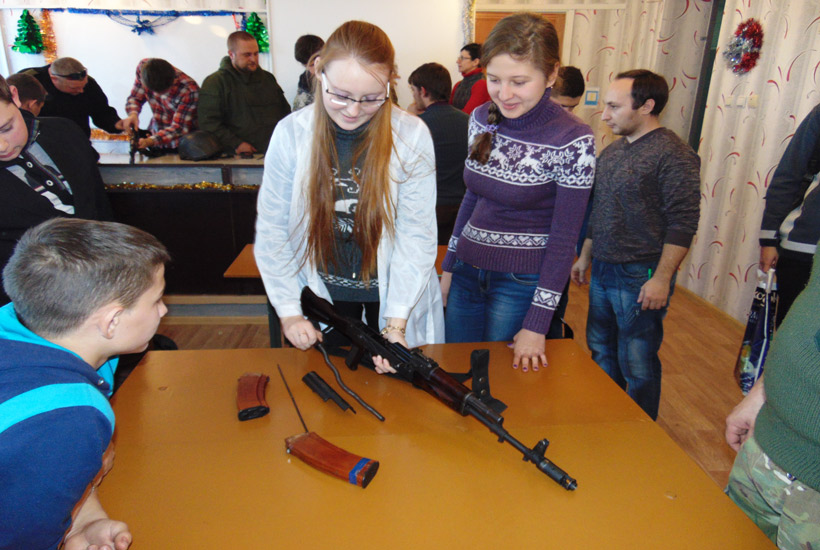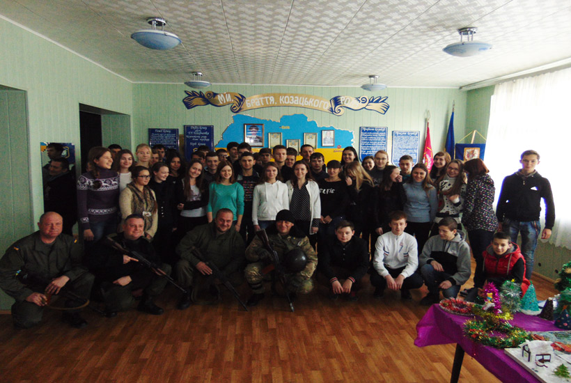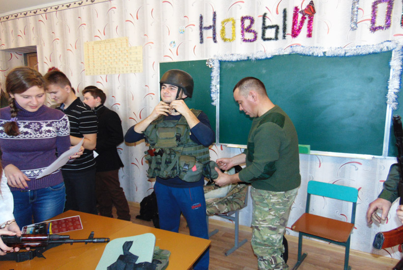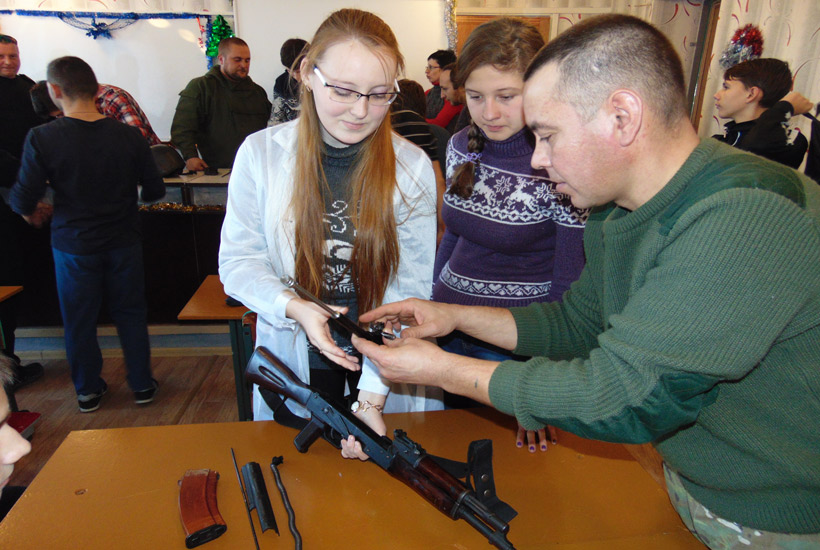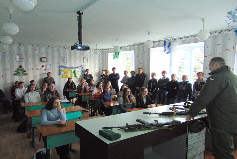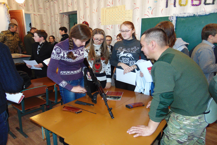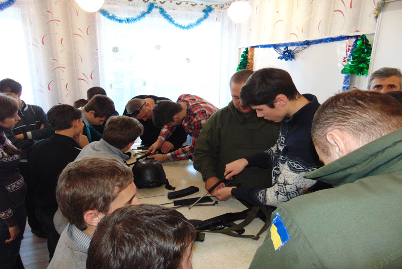 Теоретическая часть занятия была проведена с применением информативно-коммуникативных технологий с показом видео о принципах работы основных частей и механизмов автомата Калашникова. После теории ученики имели возможность практически отработать нормативы по неполной разборке и сборке автомата. Также школьникам была продемонстрирована современная экипировка военнослужащих Национальной Гвардии Украины, выполняющих служебно-боевые задачи в зоне проведения антитеррористической операции.