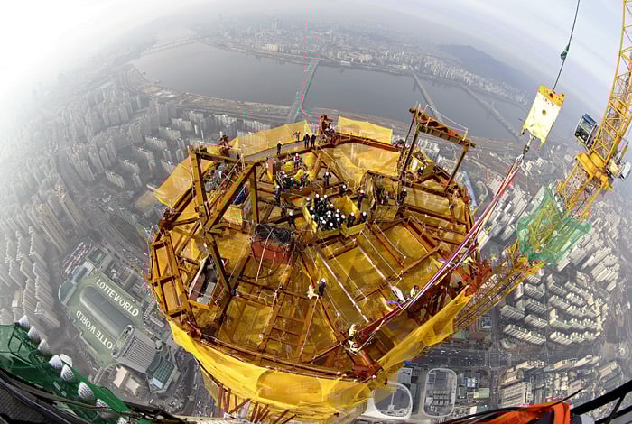 В Сеуле завершают каркасные работы на последнем этаже 123-этажного небоскреба Lotte World Tower. Первый камень заложили еще в 2005 году, затем строительство приостановили и возобновили только в 2010-м. Закончить проект планируют в конце следующего года. Финальная высота здания составит 555 метров, что сделает его одним из самых высоких зданий в мире.