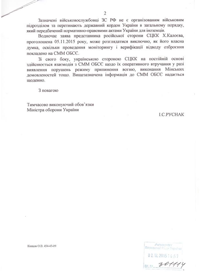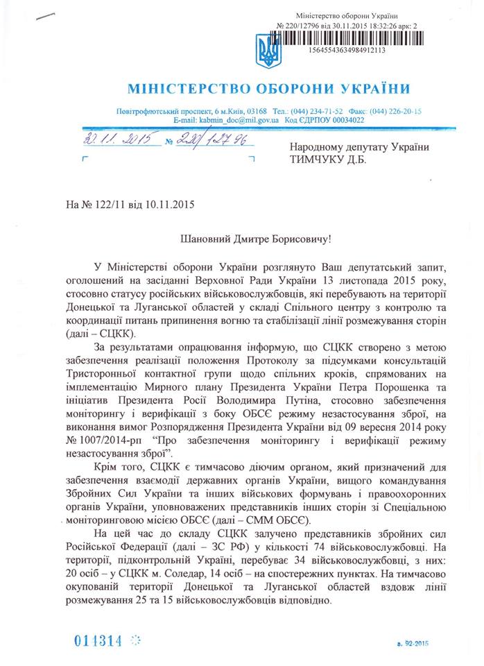 На депутатский запрос Тымчука Минобороны Украины отвечает, что российские военные, находящиеся на территории Украины, имеют статус обычных «иностранцев», соответственно, и границу пересекают «в общем порядке, предусмотренном нормативно-правовыми актами Украины для иностранцев».