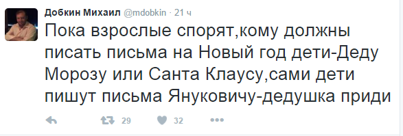 "Пока взрослые спорят,кому должны писать письма на Новый год дети-Деду Морозу или Санта Клаусу,сами дети пишут письма Януковичу-дедушка приди", - написал Добкин на своей странице в Твиттере.