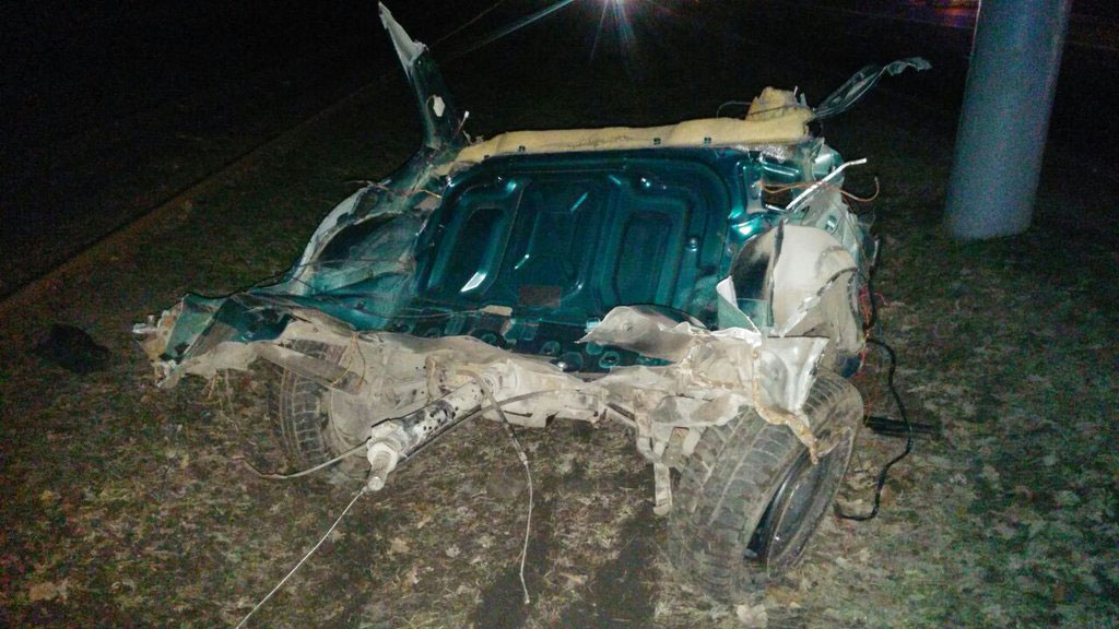 Автомобиль BMW выехал на полосу встречного движения, ударил Mitsubishi. От удара BMW отбросило на столб. Машина порвана на куски, водитель погиб на месте.