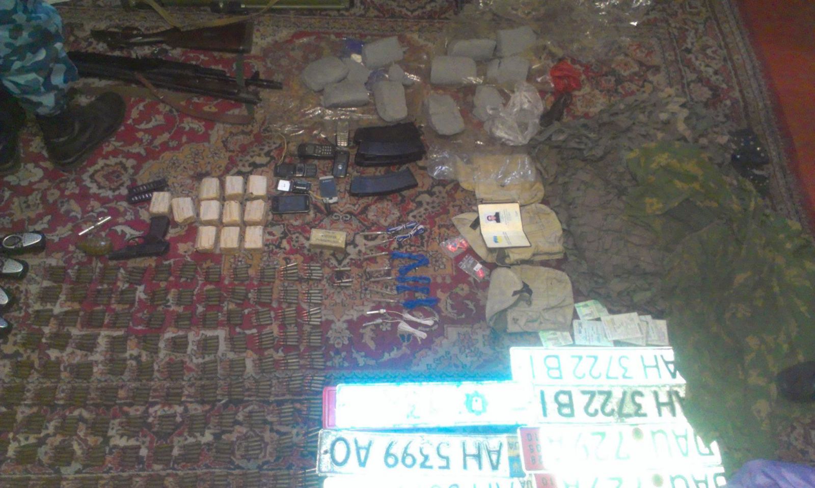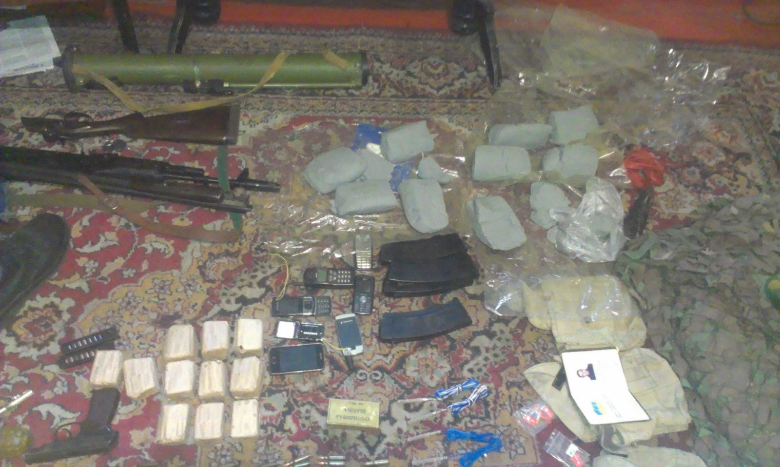 Сотрудники спецслужбы изъяли у диверсанта девять килограммов пластида, детонаторы, гранатомет РПГ-26, гранаты Ф-1, автомат Калашникова, пистолет Макарова и патроны различного калибра.