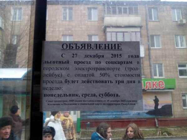 С 27 декабря в луганских маршрутках появились объявления о сокращении льгот на проезд. Согласно новым правилам, скидка 50% на проезд в электротранспорте по соцкартам будет действовать только три дня в неделю. Об этом сообщает Главное со ссылкой на Информатор.