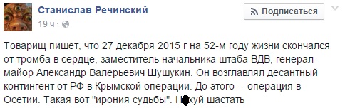В России на 53-м году жизни 27 декабря умер заместитель начальника штаба воздушно-десантных войск РФ генерал-майор Александр Шушукин, который руководил операцией по захвату украинского полуострова Крым.