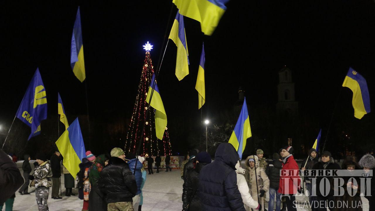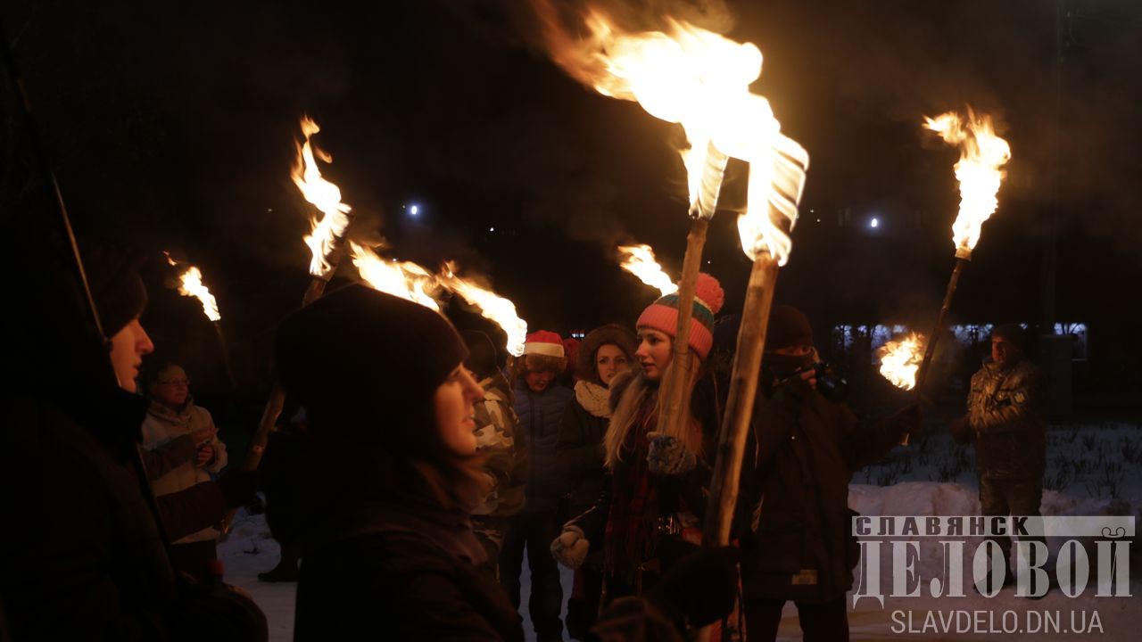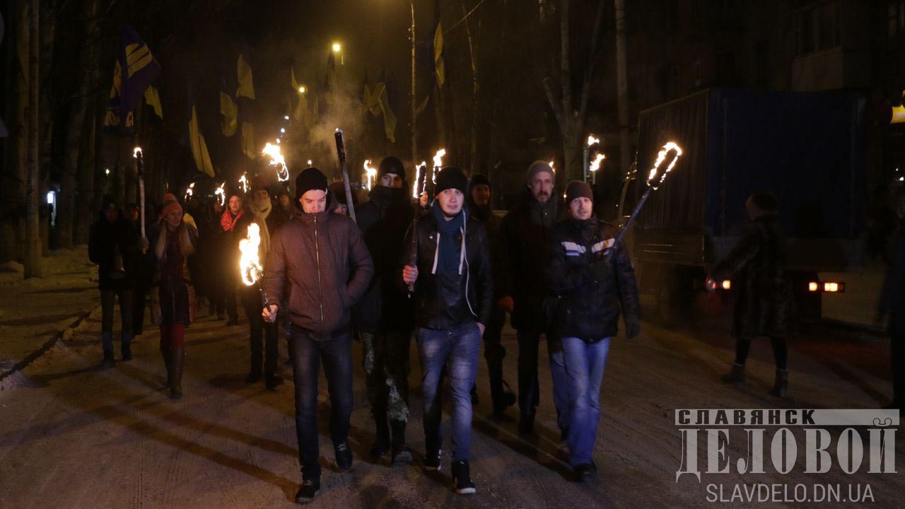 Жители города Славянска (Донецкая область) 1 января провели первое в истории города факельное шествие в честь дня рождения руководителя ОУН Степана Бандеры.