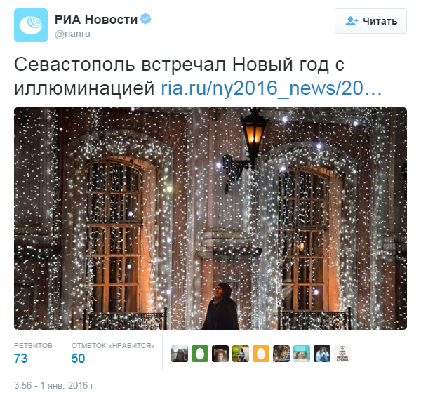 "В новый год с новыми фейками, подумали в "РИА Новости" и написали такой вот твит. Все бы хорошо, вот только "иллюминация" из ресторана "Пушкин" в Москве..." — прокомментировал Stopfake твит "РИА Новости" и выложил его скриншот.