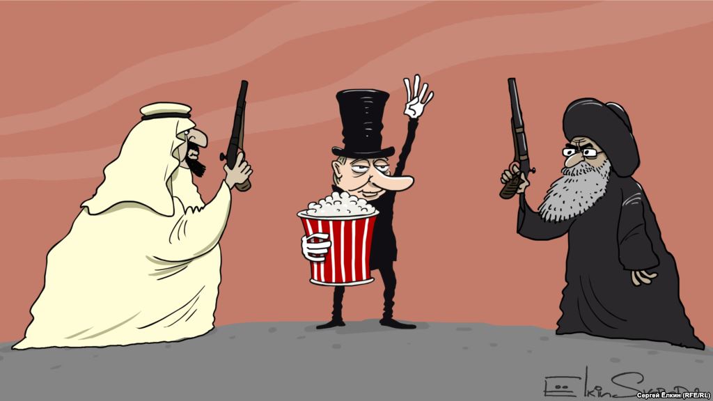Российский карикатурист Сергей Елкин пошутил над заявлением России о том, что она готова выступить посредником между Ираном и Саудовской Аравией.