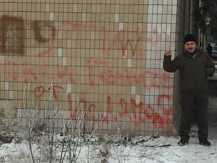"Путин спаси жителей Геническа от Ислямова !" Одни жители это написали, другие утром затерли . Мы приехали уже к такому внешнему виду надписи . Подобные надписи появились и на вокзале. "Новоалексеевец - убей в себе укропа!", - написал он.