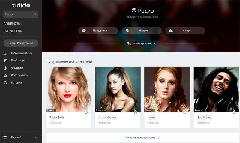 В копилке tidido находятся более тридцати миллионов песен, собранных в готовые музыкальные подборки, которые можно слушать совершенно бесплатно и на чем угодно. Платформа для меломанов полностью запущенна и отлично подходит не только для домашнего использования. Адаптивный дизайн сайта будет удобен и для использования на мобильных устройствах, необходим только доступ в интернет. Такое онлайн радио в дорогу будет как нельзя кстати каждому, кому не безразлична музыка. Пользователь может выбрать как подборку композиций по жанрам, будь то чилаут, рок, рэп, рок или другое направление, так и просто подборку лучших песен портала tidido.