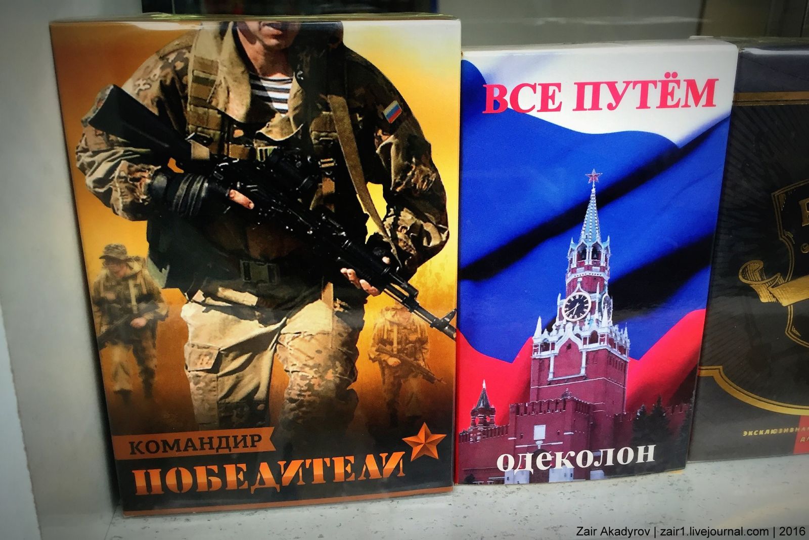 В Крыму в продажу поступили «патриотичные» одеколоны «Русский дух. Гвардеец», «Наш Крым», «Командир. Победители» и «Все путем». Об этом на своей странице в Facebook сообщил крымский блогер Заир Акадыров.