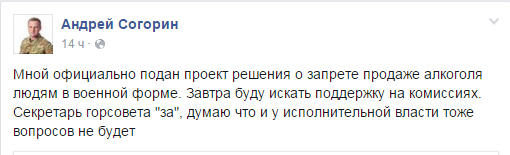 Речь идет о запрете реализации спиртных напитков на период проведения антитеррористической операции на Донбассе с целью "обеспечения общественного порядка в городе и недопущения совершения правонарушений и преступлений, связанных со злоупотреблением алкогольных напитков отдельными военнослужащими".