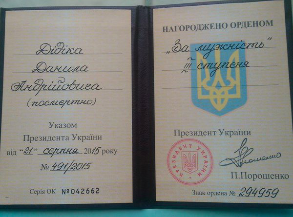 Орден «За заслуги» III степени отцу погибшего Данилы Дидыка передал заместитель председателя Харьковской облгосадминистрации Михаил Черняк.