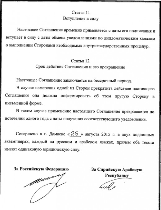 Соглашение подписали в Дамаске 26 августа 2015 в двух экземплярах - на русском и арабском языках, причем оба текста имеют одинаковую силу.