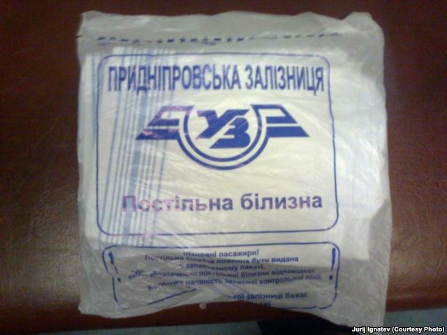 Проводники в старой форме первым делом осматривают билеты, затем предлагают пассажирам фирменное постельное белье в закрытой целлофановой упаковке с украинской фирменной символикой и надписью «Постільна білизна. Придніпровська залізниця».