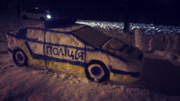 В Харькове на проспекте Победы из снега слепили полицейский автомобиль.