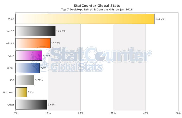 С момента выхода в июле прошлого года новая операционка Microsoft, “универсальная” Windows 10, постепенно обходила менее успешных “родственниц”. По данным StatCounter за январь 2016-го, “побеждена” оказалась и Windows 8.1. Однако до популярности Windows 7 “десятке” все еще далеко.