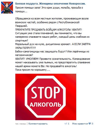 "Ситуация уже стала плачевной, вы понимаете, что вы намеренно спаиваете наших ребят, каждый день снабжая их спиртным? Моральный дух на нуле, дисциплина хромает. А ЕСЛИ ЗАВТРА УКРЫ ПОПРУТ???