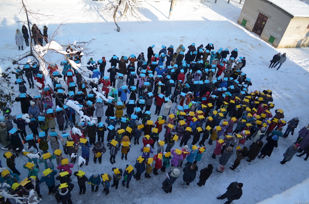 Все участники флешмоб-акции выстроились в форме флага, создав его «живой» образ, когда подняли над головой желтые и голубые листы бумаги. Целью акции было воспитание патриотизма у детей Луганщины, социальной гражданской активности, поднятия национального духа братства.