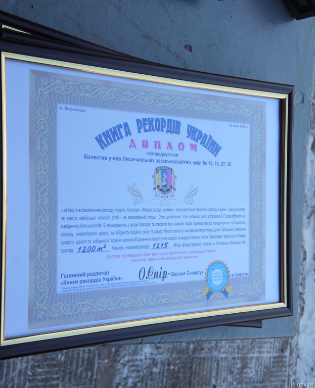 Лисичанск вошел в историю Книги рекордов Украины в категории «Массовые мероприятия. Размеры», как «Флешмоб-акция создание флага Украины из листов бумаги с участием наибольшего количества детей и на максимальной площади».