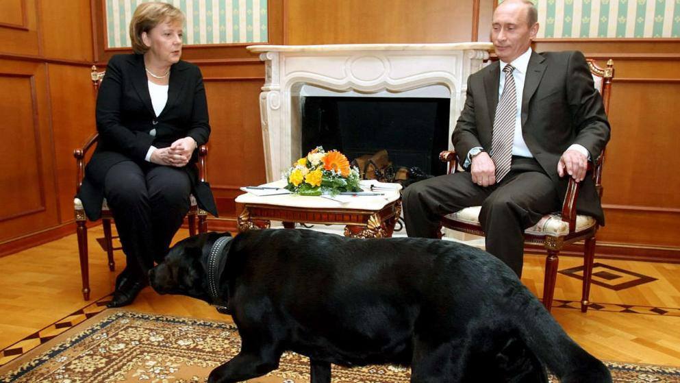 На фотографии видно, как неприятно немецкому канцлеру нахождение пса в зале, и как доволен Путин пугающим эффектом присутствия животного.