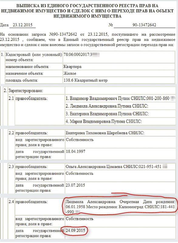 23 июля 2015 квартира по наследству перешла сестре Людмилы Путиной — Ольге Александровне Цомаевой. А уже 24 августа 2015 квартира перешла Людмиле Александровне Очеретной, чье имя и отчество, а также дата и место рождения совпадают с данными Людмилы Путиной.