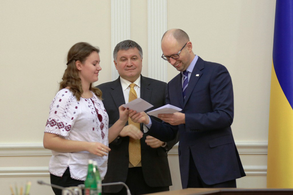 Арсений Яценюк поздравил ребят и девушек с тем, что они первые в государстве получают паспорта нового образца: «Это не паспорта бывшего советского стиля — книжечки с вклеенными фотографиями, а новый паспорт в виде идентификационной карты с чипом, на который можно внести любую идентифицирующую информацию».