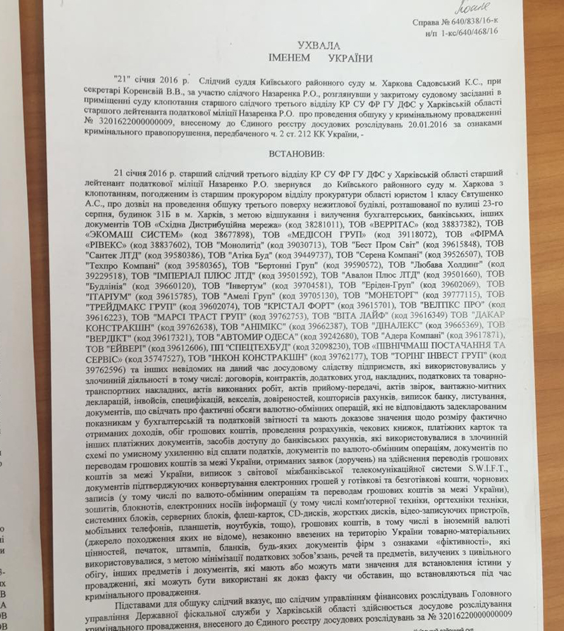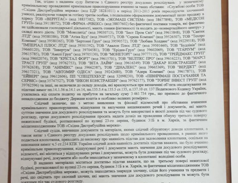 В документе речь идет о том, что компания «Восточная дистрибуционная сеть» в 2013-2015 годы, «преследуя преступный умысел», продавали товары за наличные, оформляя продажу в адрес компаний из списка без фактической поставки товаров. И что компании из списка входят в состав конвертационного центра и не уплатили в бюджет налог на прибыль в размере 3,4 млн грн.