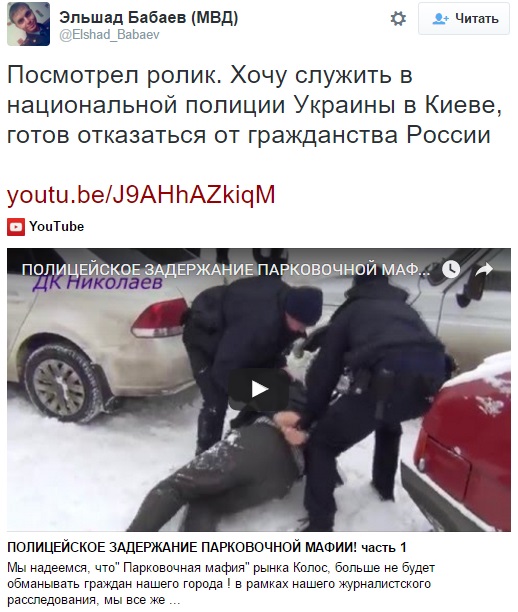 При этом Бабаев в своем Twitter написал: "Посмотрел ролик. Хочу служить в национальной полиции Украины в Киеве, готов отказаться от гражданства России".