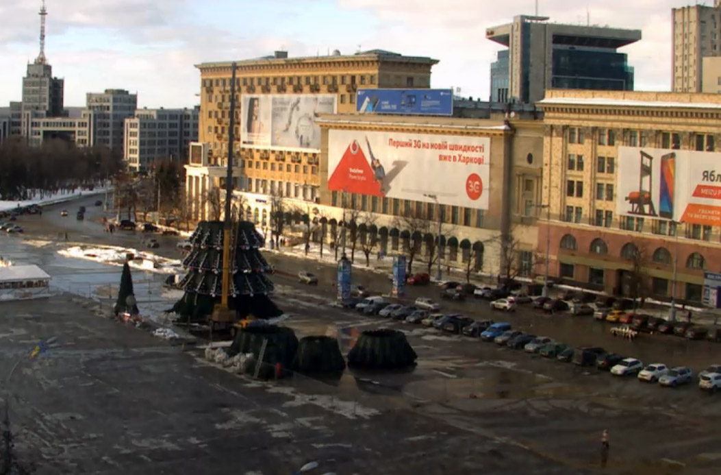 На пл.Свободы в Харькове разбирают новогоднюю елку. Рабочие демонтировали уже почти половину конструкции.