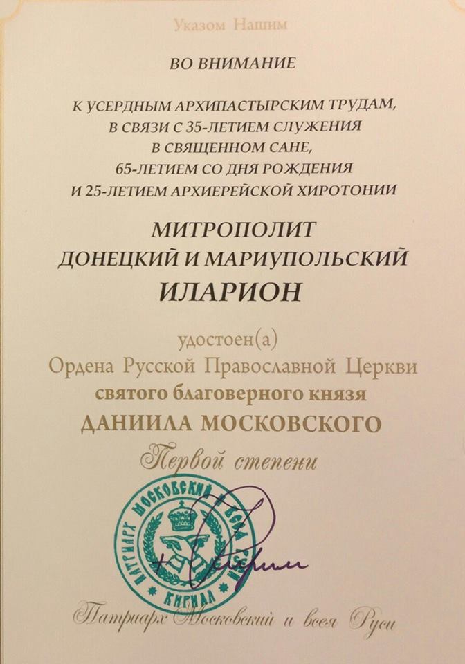 «Знаковое событие для Донецкой епархии произошло в завершении 2 дня работы Собора: Святейший Патриарх Кирилл в присутствии сонма архипастырей торжественно вручил Высокопреосвященнейшему митрополиту Илариону орден святого благоверного князя Даниила Московского», - отмечается в сообшении.