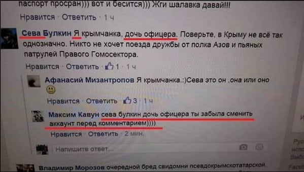Судя по переписке, представленной в фото, один из работников многочисленной армии "кремлеботов" с ником Сева Булкин забыл сменить логин в переписке и выдал себя за "дочь офицера".
