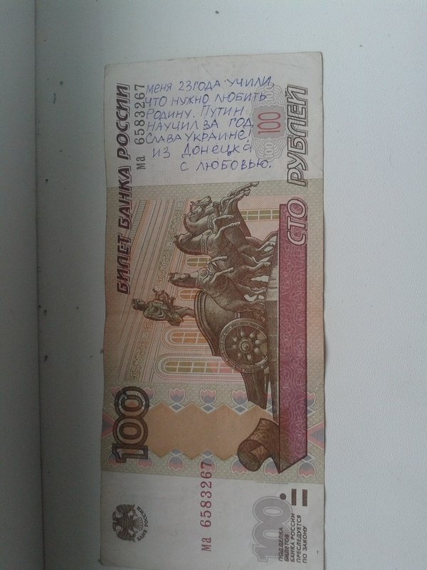 «Меня 23 года учили, что надо любить Родину. Путин научил за год. Слава Украине! Из Донецка с любовью », - говорится в надписи на купюре.