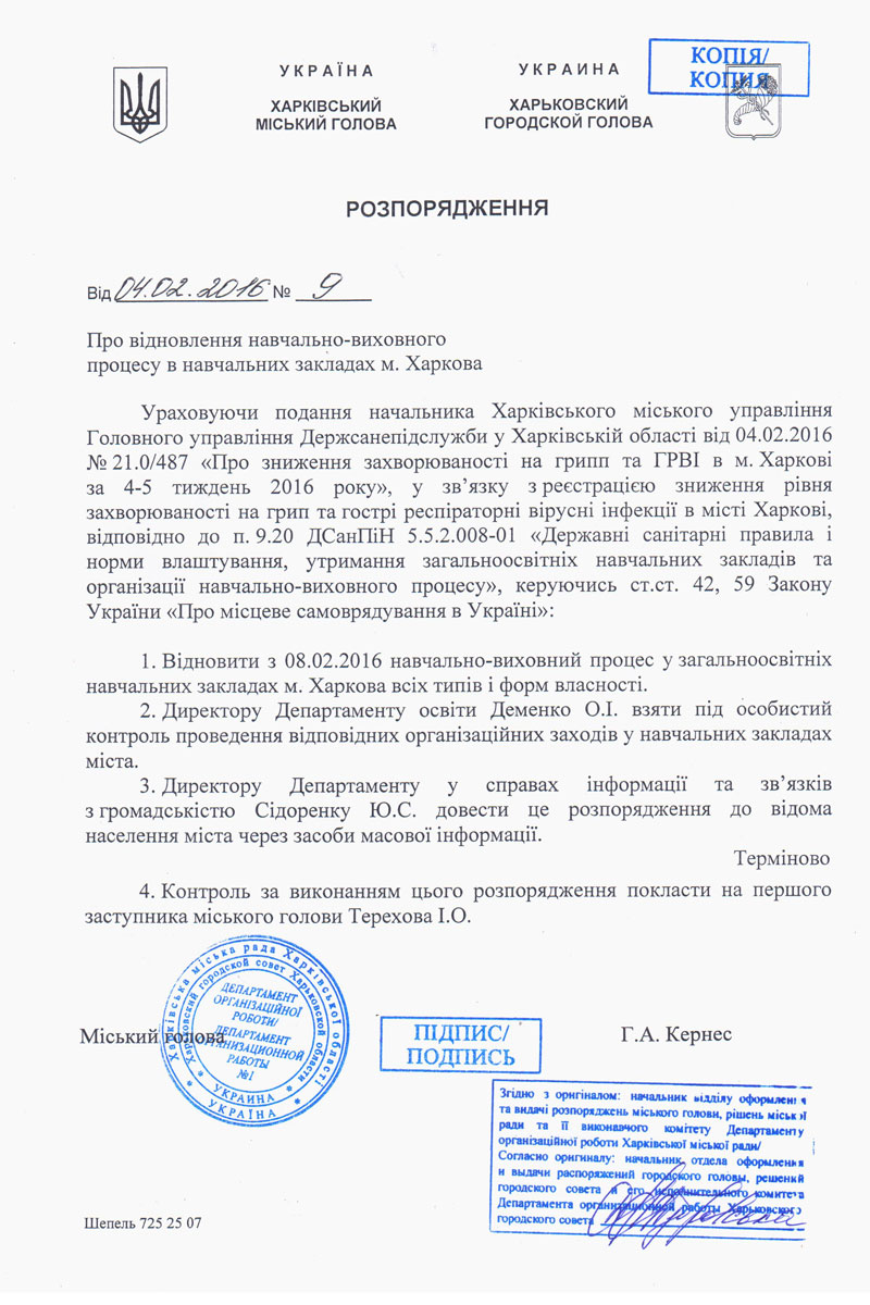Как утверждает чиновник, распоряжение подписал харьковский городской голова Геннадий Кернес.