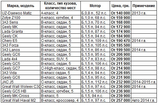 На первом месте с ценой от 140 000 гривен находится авто из Узбекистана UZ-Daewoo Matiz. Далее следуют украинский ЗАЗ Sens и различные китайские бренды, - пишет автопортал.