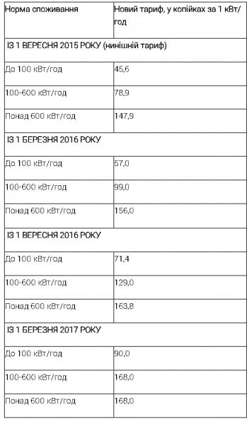 Ближайшее подорожание электроэнергии состоится с 1 марта 2016 года: за 1 кВт / ч придется платить 57 копеек (при потреблении до 100 кВт / ч) и 99 копеек (при потреблении более 100 кВт / ч). С 1 сентября 2016 тарифы снова вырастут: за 1 кВт / ч придется платить 0,714 гривны (при потреблении до 100 кВт / ч) и 1,29 гривны (при потреблении более 100 кВт / ч). А уже с 1 марта 2017 года должен состояться последний из запланированных ростов цен: за 1 кВт / ч придется платить 90 копеек (при потреблении до 100 кВт / ч) и 1,68 гривны (при потреблении более 100 кВт / ч) .