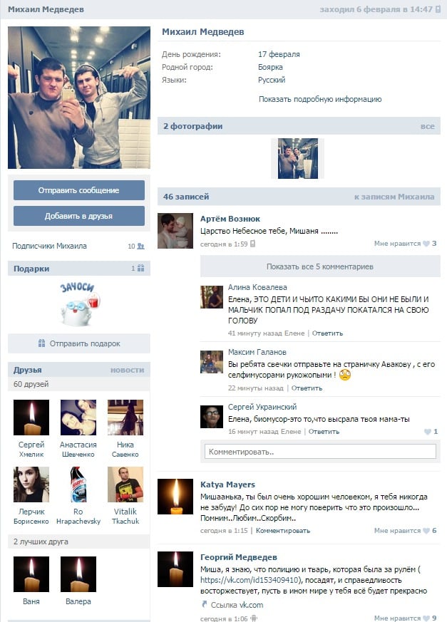 Как удалось узнать "Вестям" из соцсетей, все парни, которые в тот момент ехали в машине, родом из Боярки, учились в одной школе. Погиб самый молодой из них - Михаил Медведев, которому должно было исполниться 17 февраля 18 лет.