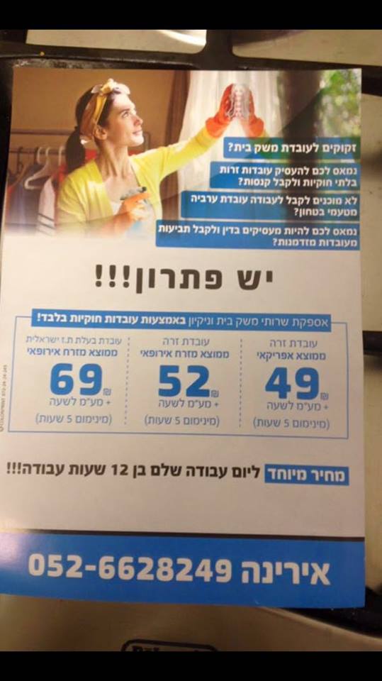 За час работы гастарбайторши из России жители Тель-Авива готовы заплатить 69 шекелей. Если она будет из Европы, то цена падает сразу до 52 шекелей, прислуге из Африки предлагается платить 49 шекелей.