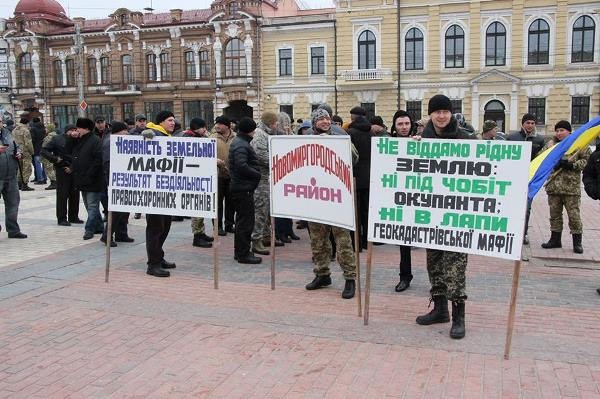По словам протестующих, чиновники Госгеокадастра требуют у них взятки в размере 500 евро. Также они утверждают, что землю, которую им выделяют, отдают другим землевладельцам, не имеющим отношения к АТО, а военнослужащие получают отказы. К примеру, только в Новомиргородском районе с 1 января 2016 участники АТО получили более 80 отказов.