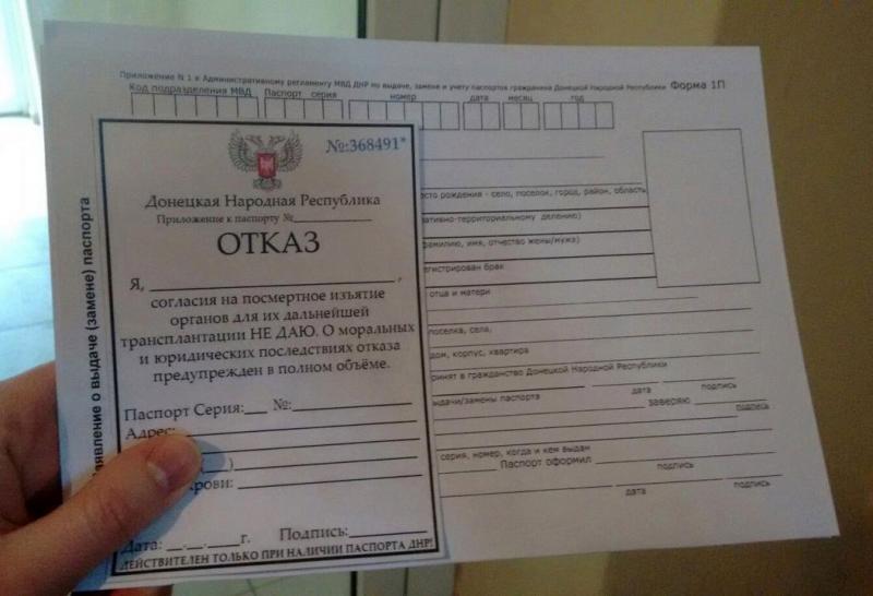 «Сегодня ходила в паспортный стол, чтобы заменить украинский паспорт на наш. Помимо разных бумажек, мне выдали еще бланк ОТКАЗА от трансплантации моих органов. Как мне объясняли, что без этого отказа после смерти без спроса смогут взять любые органы для трансплантации...