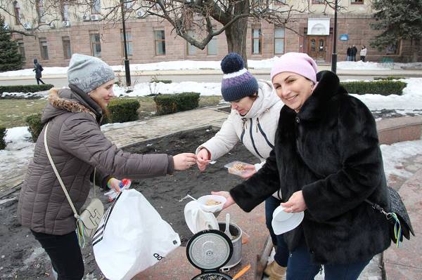 Волонтери ГО "Серця матерів Кіровоградщини" приготували бійцям на обід кашу з тушонкою та пригощали їх просто на площі.