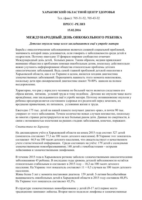 В нем идет речь о том, что на диспансерном учёте в Харьковской области на конец 2015 года состоит 327 онкобольных детей. Показатель составляет 77,3 на 100 тысяч детского населения. В Украине этот показатель составляет 66,9 на 100 тысяч детского населения. В Харьковском областном центре здоровья, говоря о детях, уверяют, что высокий показатель заболеваемости на Харьковщине «свидетельствует о качественном учете статистической информации».