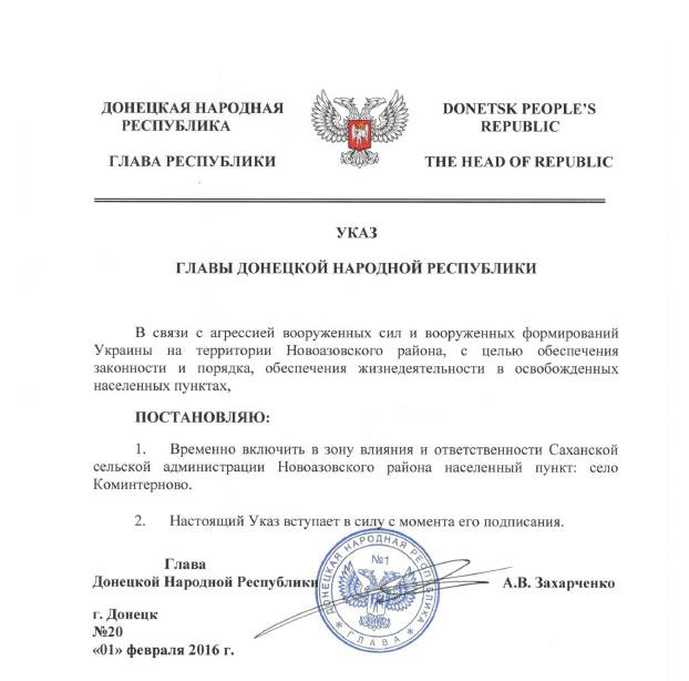 "Интересно, что согласно «указу» Захарченко, включение Коминтерново «в зону влияния» террористов – временное. Очевидно, полагают, что их оттуда таки выпрут. С другой стороны, обратите внимание на дату подписания «указа»: Коминтерново было захвачено в конце декабря 2015 г, боевики прождали больше месяца (а вдруг по зубам дадут?), но ничего не происходило, и только тогда они «легализовали отжим»", - добавил эскперт.