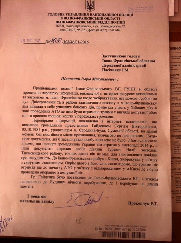 «Помните это фото несколько недельной давности и рассказы о том, как государство не заботится о своих героях-участников АТО? Посты о «чиновниках-негодяях», которые не обеспечили протезирование герою, который «защищал Донецкий аэропорт» и человек должен нищенствовать на вокзалах и у церквей в г. Ивано-Франковске… Эту информацию массово подхватили российские СМИ и прокремлевские тролли ...Но, как и предполагалось, это оказался очередной фейк «всьопропальщиков"… Итак, прошу знакомиться: на фото Гайденко Сергей Викторович 03.10.1981 года рождения. В зоне АТО никогда не был, а ноги потерял от обморожения еще задолго до начала боевых действий», - рассказал Павленко.